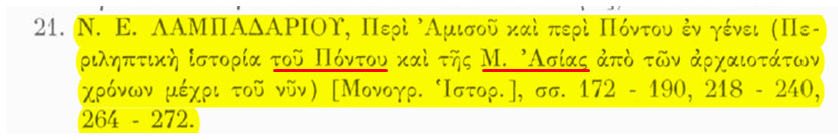 Ν. Ε. ΛΑΜΠΑΔΑΡΙΟΥ, Περί Άμισοΰ καί περί Πόντου έν γένει (Περιληπτική ιστορία τού Πόντου και τής Μικράς ’Ασίας άπο των άρχαιοτάτων χρόνων μέχρι τού νΰν) σσ. 172 - 190, 218 - 240, 264 - 272.